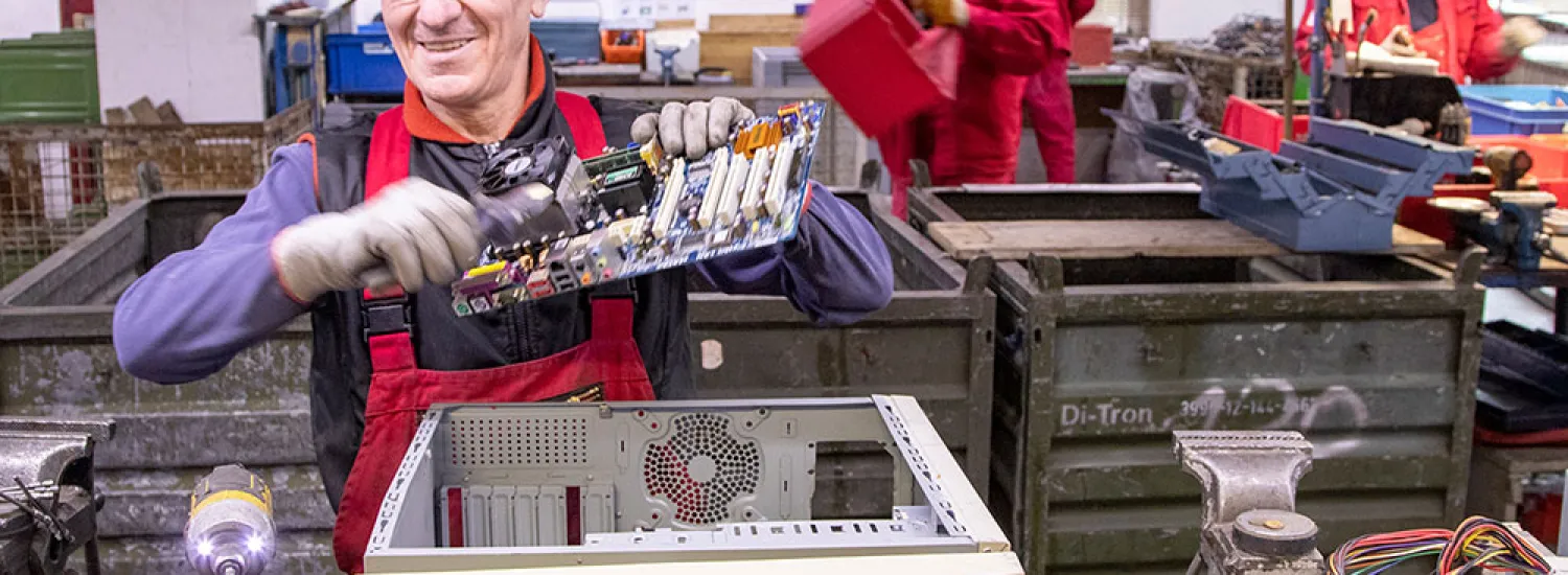 In den Werkstätten und auf dem Hof werden Elektroaltgeräte zerlegt und sortiert, dies ist der Aufgabenbereich der Helfer/innen in der Zerlegung. Auf dem Hof findet das wichtige Vorsortieren der Geräte statt. In den Werkstätten erfolgt dann die eigentliche Demontage. Mit Handwerkzeug und Akkuschraubern werden die Altgeräte zerlegt, schadstoffhaltige Bauteile werden entfernt und zum weiteren Recycling sortiert.